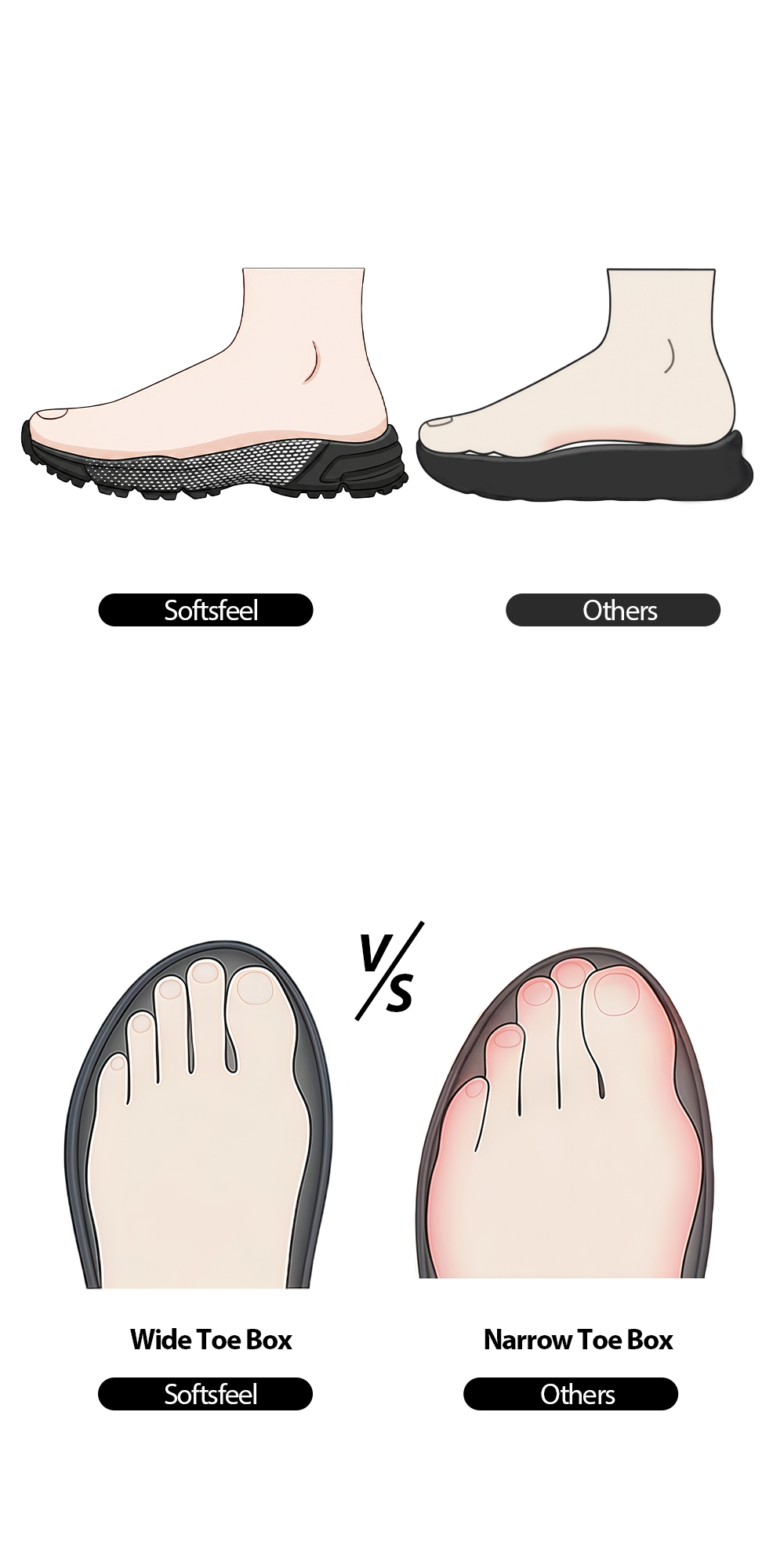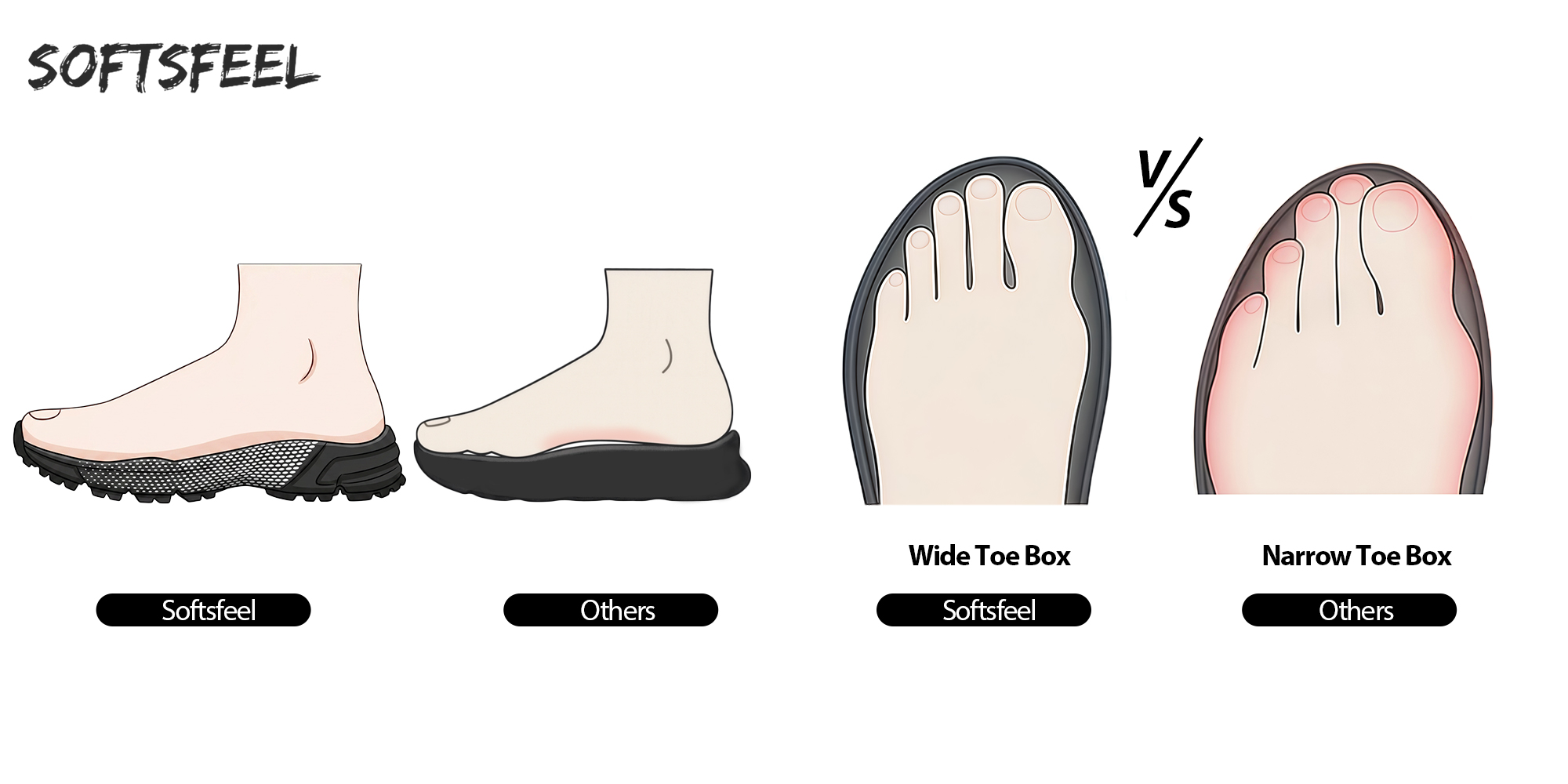 Softsfeel's Rebound Core® Shoes: guarantee 8 hours of fatigue-free walking and standing! These podiatrist-approved sneakers will put you in comfort all day long! Bid farewell to cramped toes as our extra-wide forefoot area boosts blood circulation. Even when fatigue sets in, our innovative heel ring maintains consistent gait posture, keeping you steady on your feet.